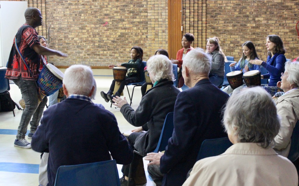 During an interactive drumming session, participants are guided by a facilitator to hold their own beat while others play opposite interlocking rhythms. Individuals are given a chance to express themselves within the contained structure of the session. A strong bass drummer holds the beat.
